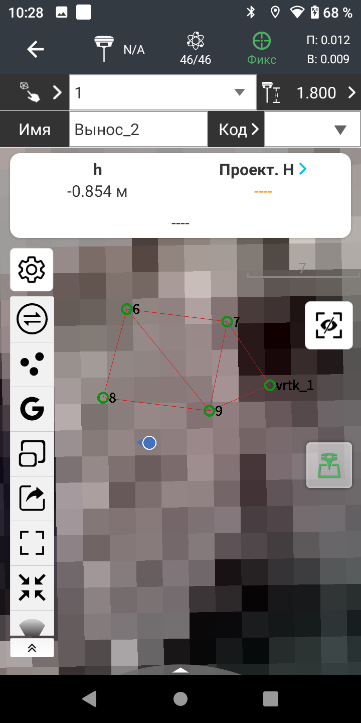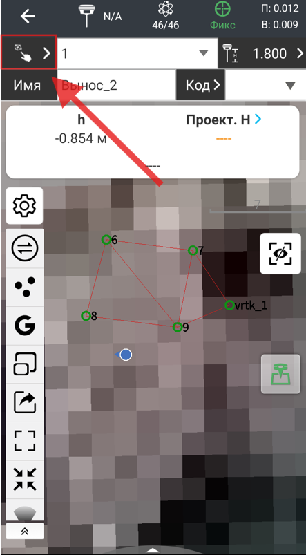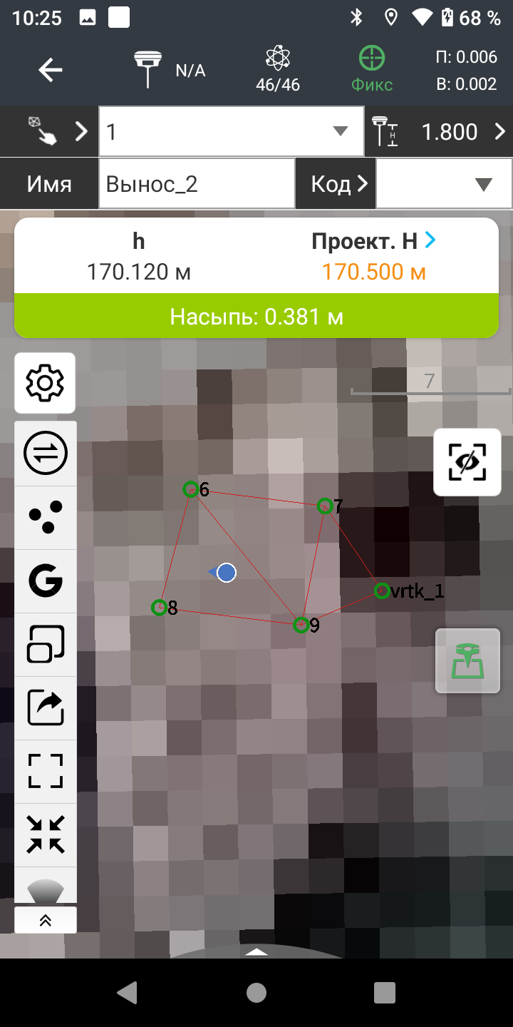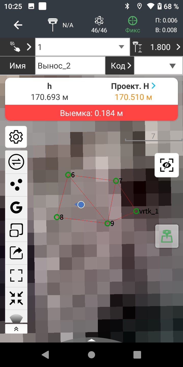 Находясь за пределами фактического расположения поверхности будет отображаться только высотная отметка приемника. В строке Проект. Н и Насыпь/Выемка будут прочерки.