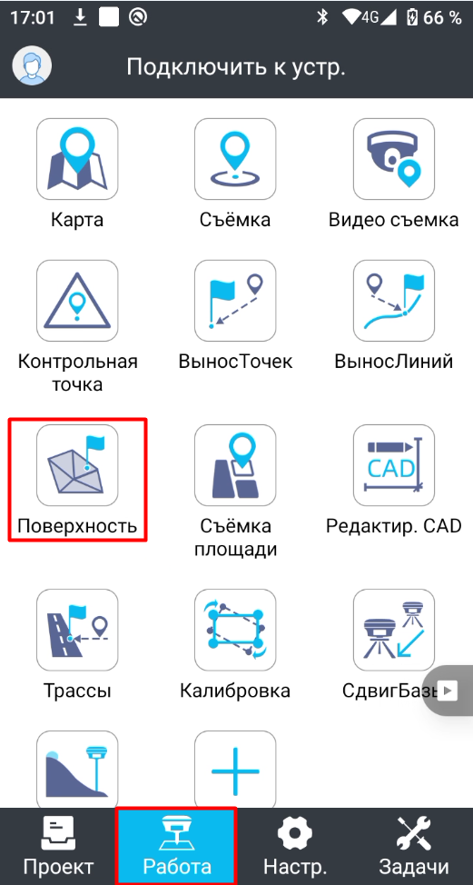 Перейдите на страницу "Работа" и откройте меню "Поверхность"
